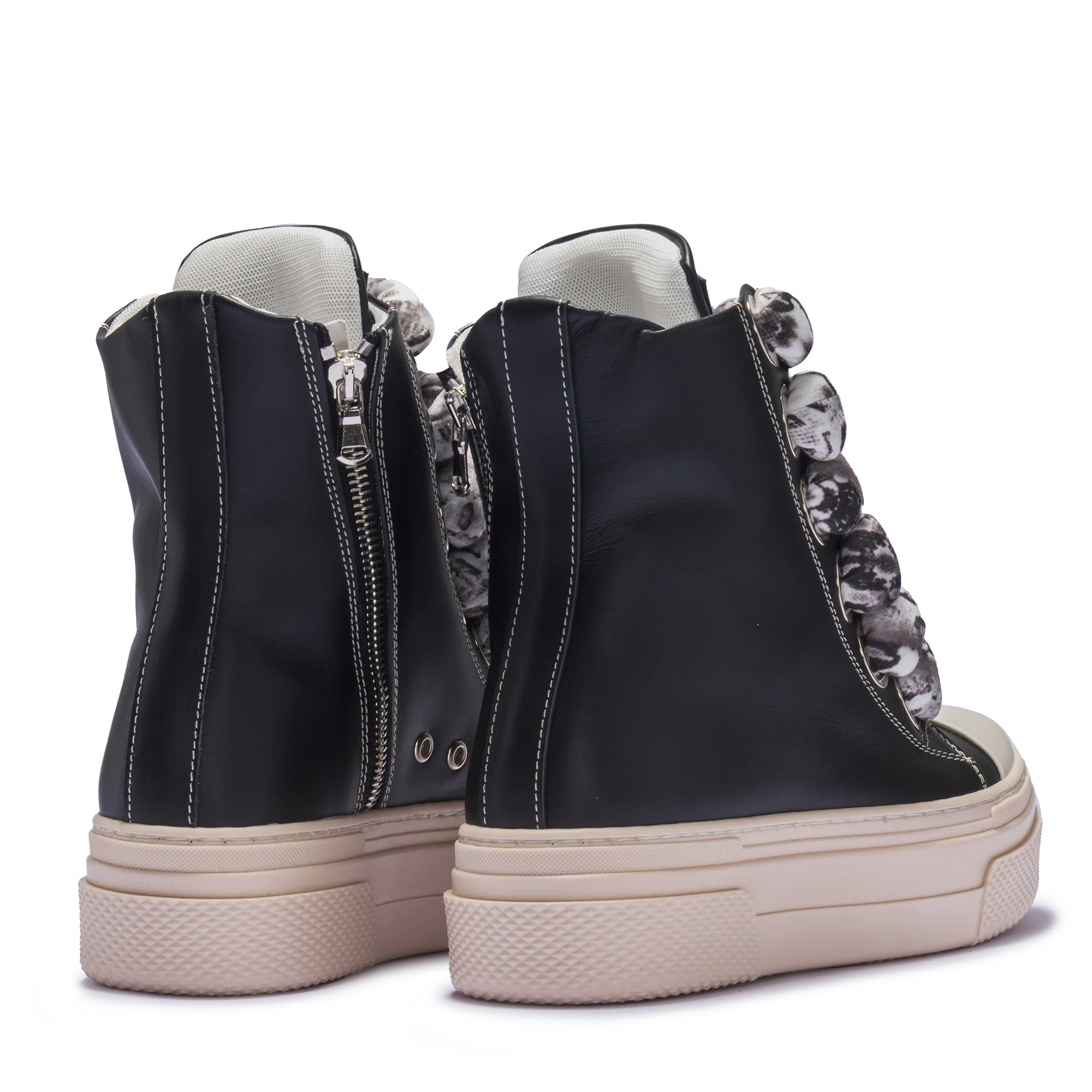 The CALIPSO – Marble Edition blends sculptural aesthetics with CR03’s bold DNA. Its oversized soft laces with marble-effect print and matte black leather upper rest on the signature cream platform sole — turning every step into a statement of design and personality.