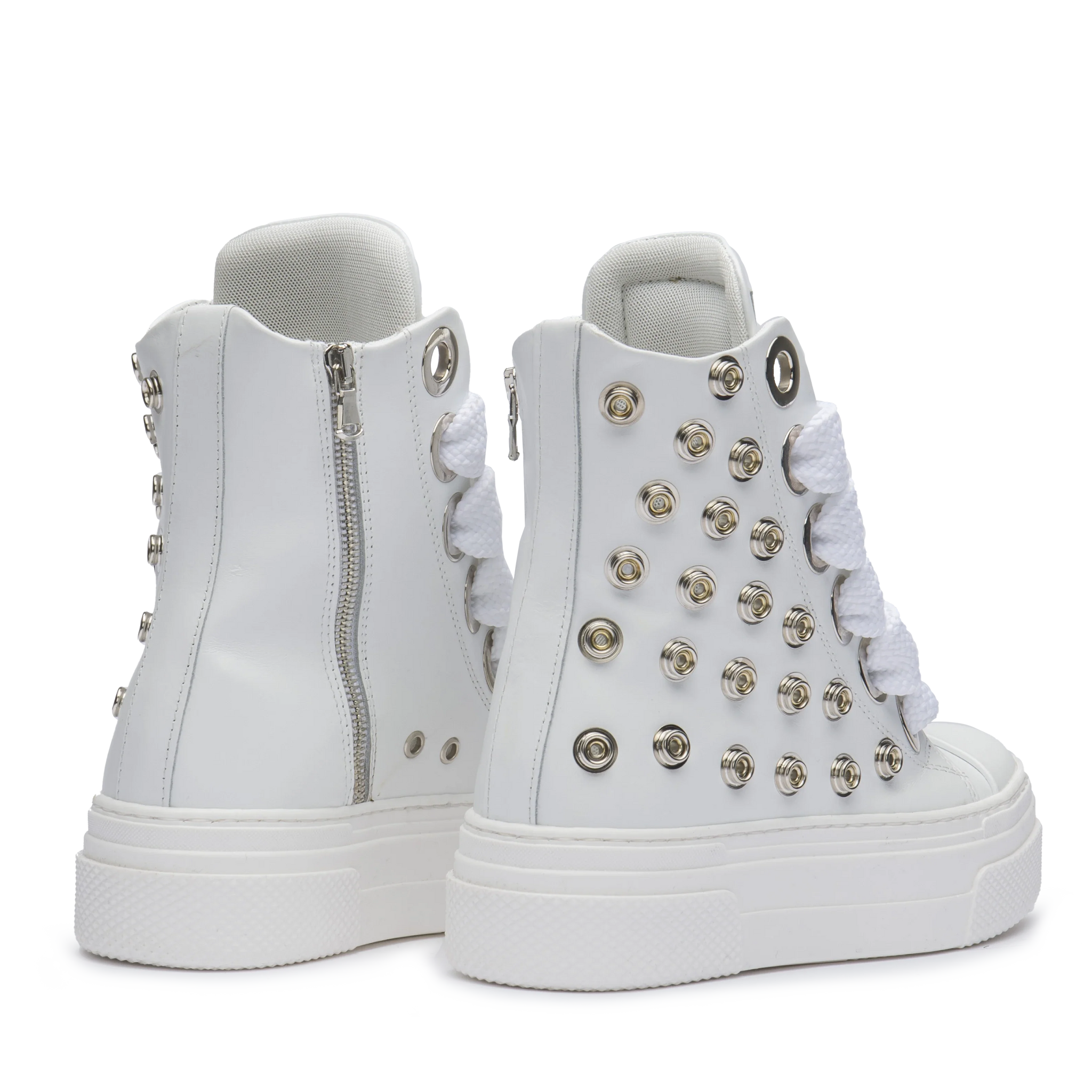 CALIPSO WHITE METAL réunit des lignes de pulite et des détails métalliques pour une esthétique audacieuse et raffinée. La peau blanche contrastée avec les maxi lunettes argentées et les lacci oversize en coton, créent une sneaker de caractère décidée et avec un style infondable CR03.