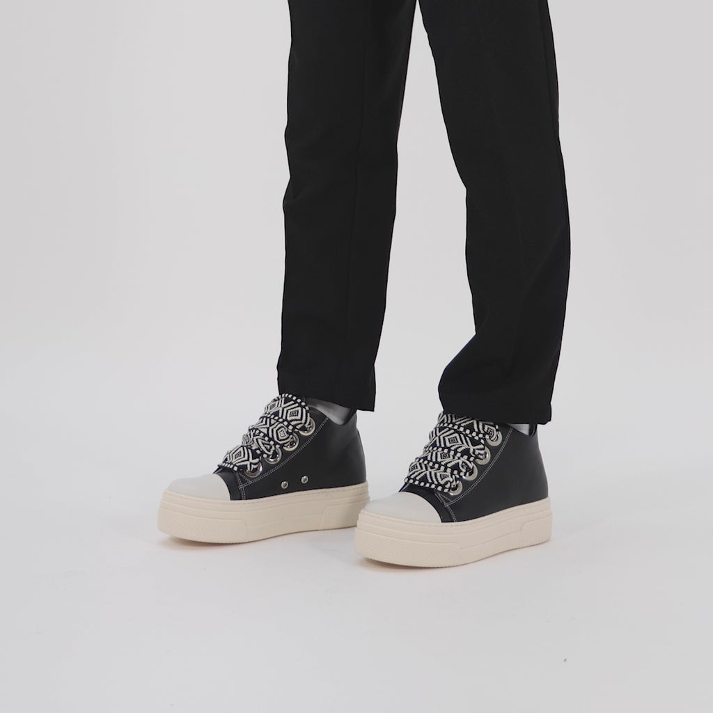 Un mélange de simplicité et de modernité qui répondra à tous vos besoins ! Seule notre marque propose un plateau solide soutenant l’ensemble de la structure en cuir noir. Ces chaussures sont ornées de lacets maxi à motif losange.